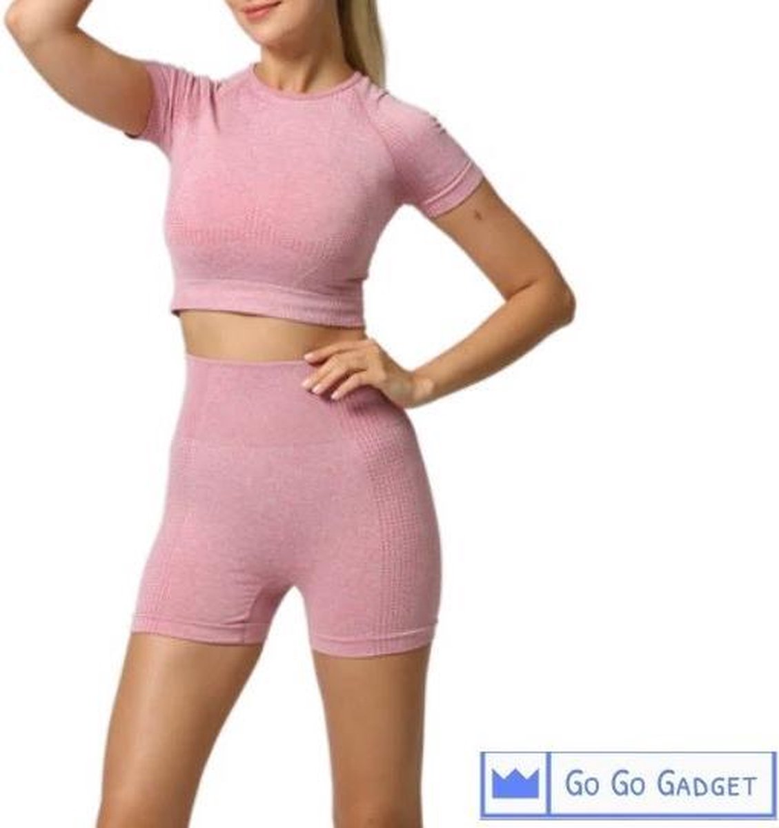 Sport outfit | high waist korte broek | crop top met korte mouw | naadloos | squatproof | roze | L